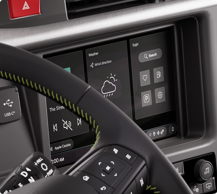 The optional infotainment system in the VNR features a 9-inch color touch screen, premium audio, and many options for navigation tools and third-party apps.